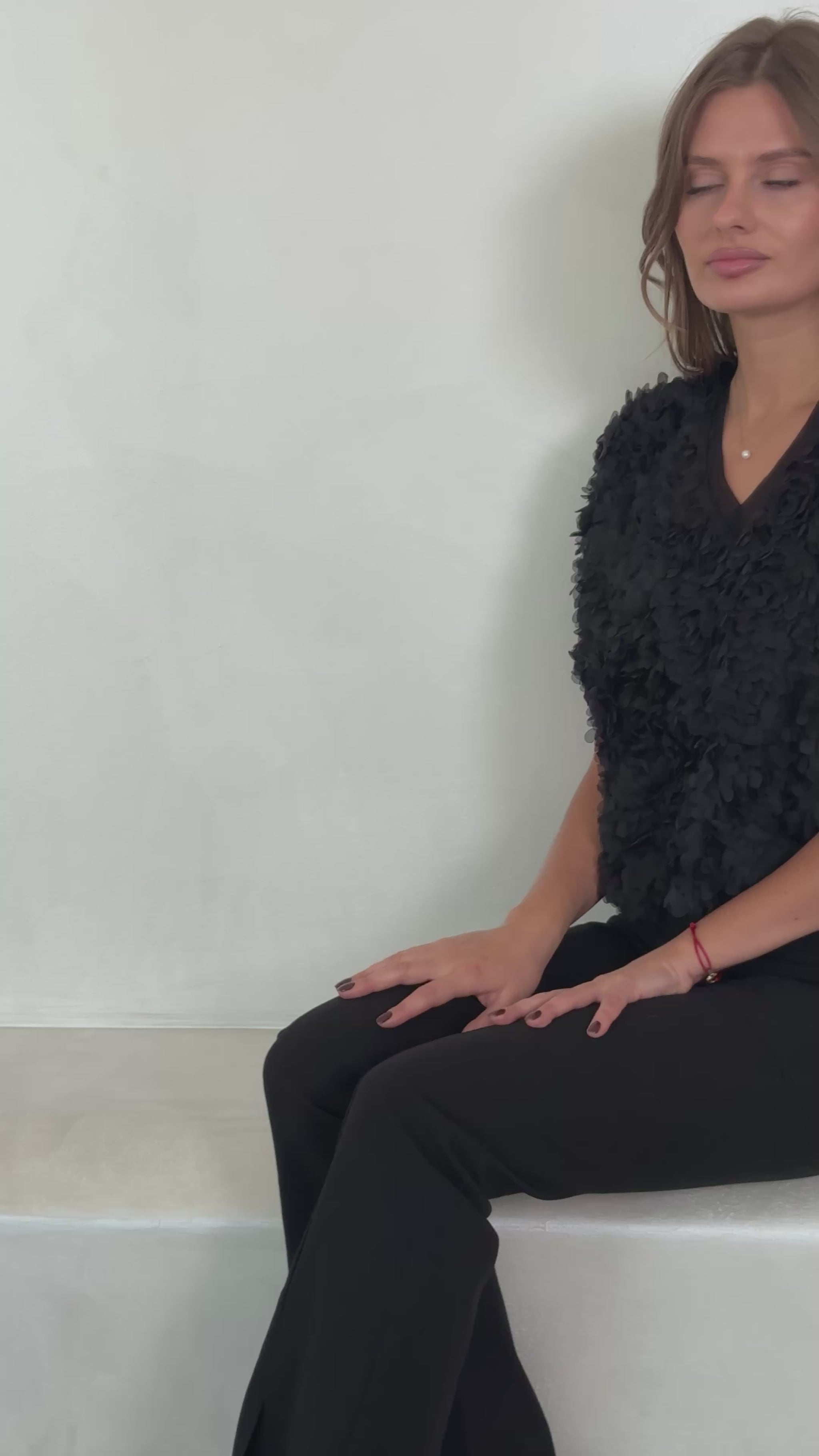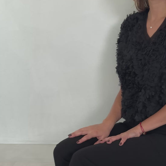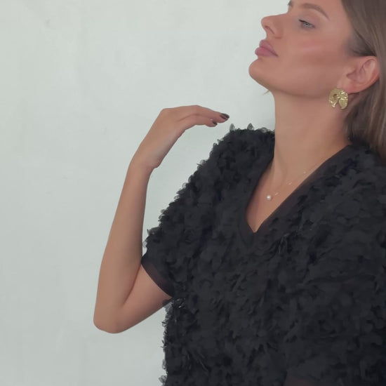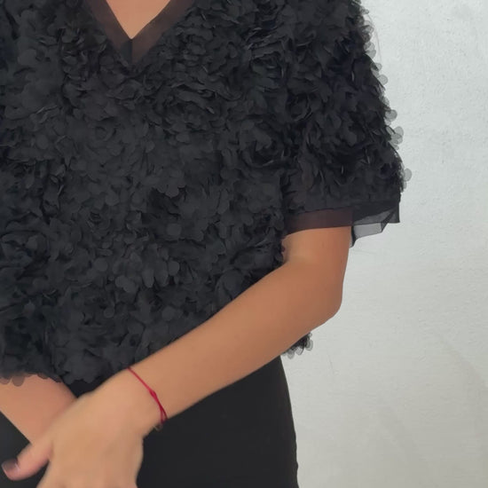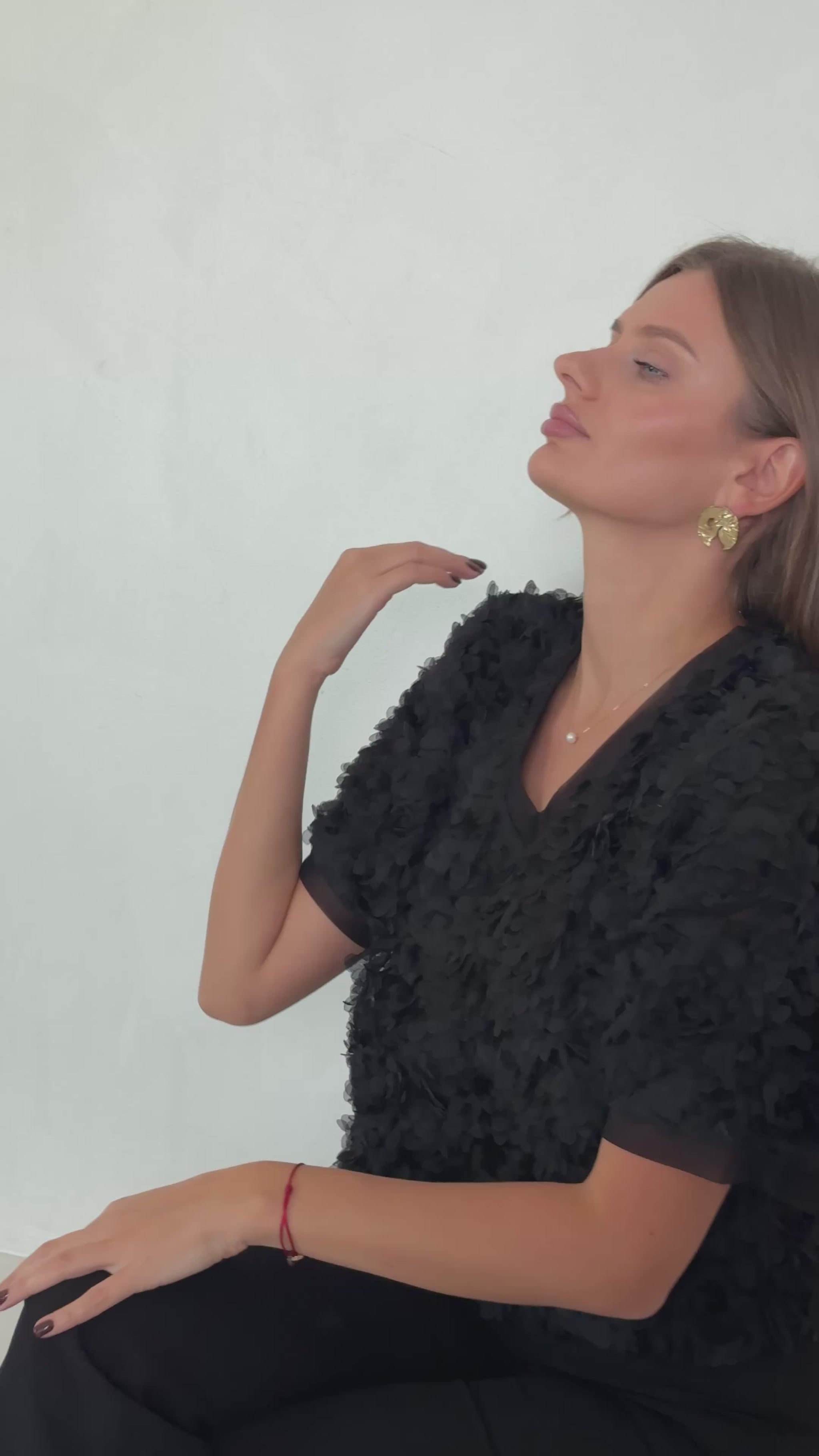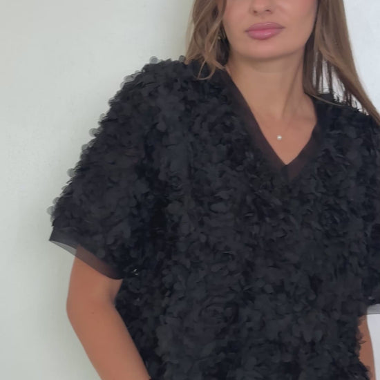 Discover our new rosette blouse in a short-sleeve version for summer. Textured rosette pattern blouse: - Loose fit - V-neck front - Short sleeves - Main material: 3D tulle with tone-on-tone floral embroidery.