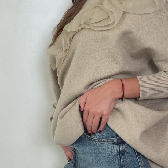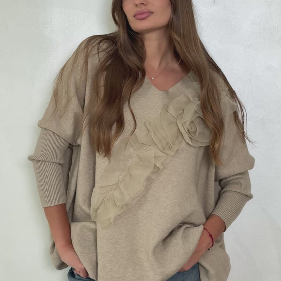 Women's V-neck sweater with flared sleeves. Ruffle detail on one shoulder adds a touch of elegance. Soft and comfortable fabric, perfect for a casual yet chic style.